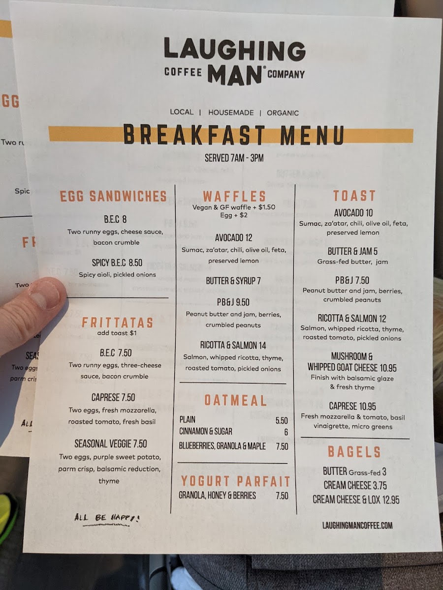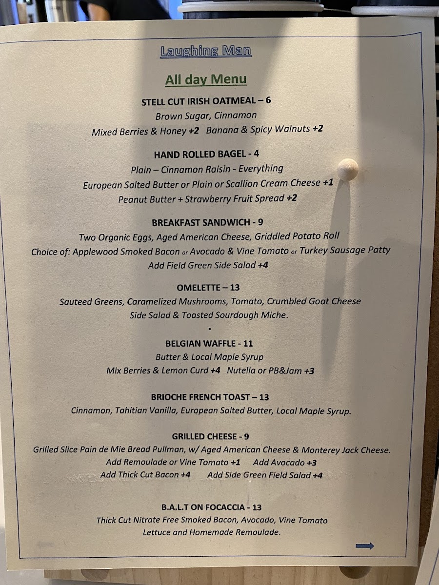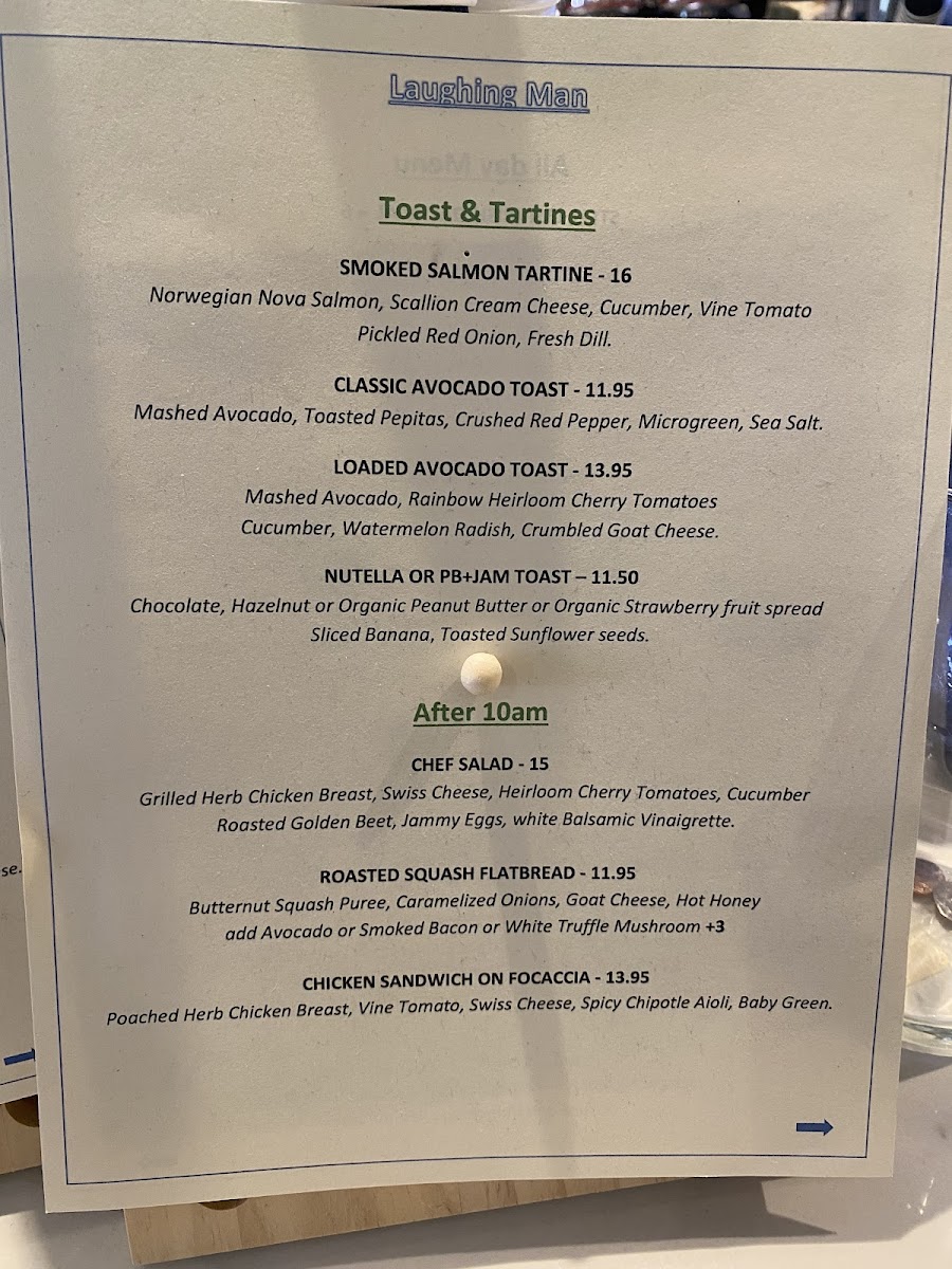 “ There are certain moments in our day that, though simple in form, hold the power to shape our outlook. Today, after dropping off Woody—a dog I’ve been training—at his home on Chambers Street, I found myself at Laughing Man Coffee. The rain had started to fall, New York’s sidewalks slick and silver. I stepped inside seeking nothing more than a dry seat and an espresso. What I found was something richer: an experience. The coffee, a blend of balance and depth, had none of the harsh acidity so common in hurried roasts. Three shots in, and I was alert, but not jittery. This was quality, not quantity. There is a kind of social texture to this place. The conversation floats at a volume that engages the senses without demanding them. It is not silence, but symphony. A café that understands the psychological need for both individual thought and collective energy. Now, I must note the absence of WiFi—once a deal-breaker for someone like me, a gig worker born in the waning days of dial-up and matured during the battles for net neutrality. We, the so-called entitled millennials, have grown to expect connectivity everywhere. Yet perhaps that expectation reveals more about our conditioning than about necessity. Laughing Man doesn’t cater to convenience—it delivers on purpose. It is not merely a place to consume, but to reflect. That, to me, is worth five stars. Not for what it lacks, but for what it offers with intention. Today despite a smaller crowd, I noticed people talking above the decibels I have my AirPods on. I think the weekday morning work crowd has better energy. Saturday Brunch, I noticed they have a square terminal I think it’s the best choice for merchants. I have a terminal myself and love it. Shout out to Jack Dorsey. Esta bueno el pan con aguacate , el café me supo un poco a citrus, Muy bueno también. Me siento muy a gusto con el servicio nuevamente. ”